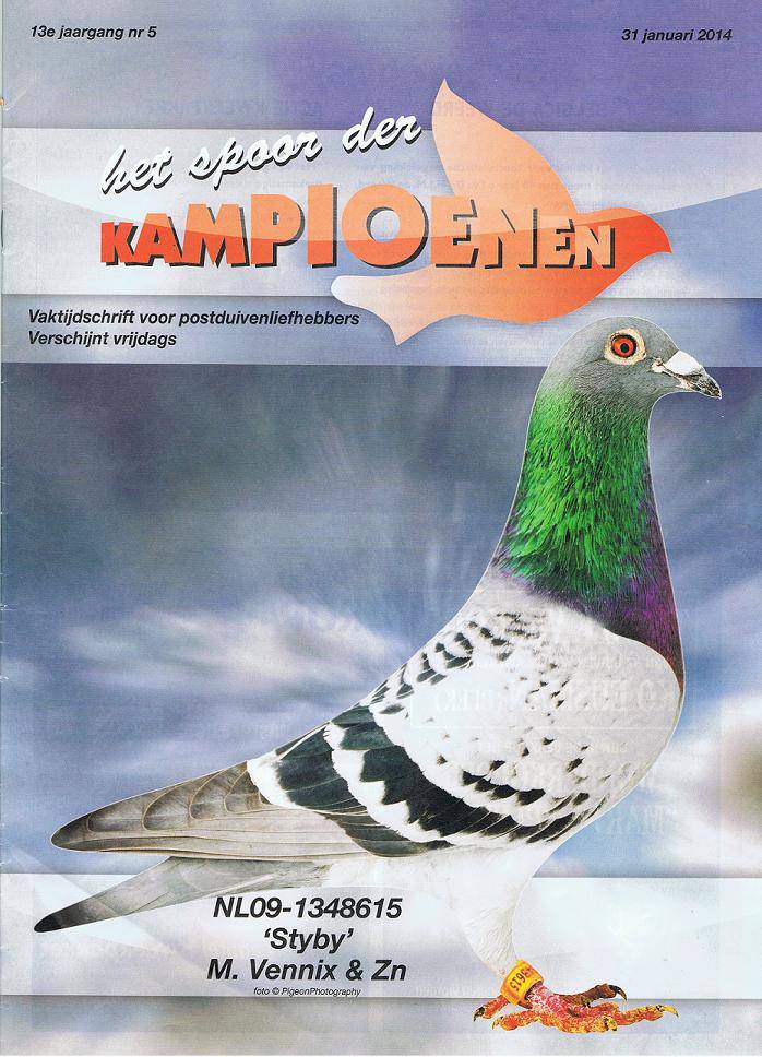 Het doet ons heel erg veel deugd dat ons fenomeen "Styby" de voorzijde van "Het Spoor der Kampioenen" siert. Het lijkt ons vrij uniek dat twee zonen ("The Wizard" en "Styby") uit hetzelfde koppel (" De Cobra" x 595) bij twee verschillende liefhebbers (Bert Klein Haneveld en mijn vader) zulke prestaties neerzetten dat zij een plaats verdienen op het postduivenmagazine van Nederland. En dat "Styby" zijn plaatsje op het spoor verdiend heeft daarover bestaat geen enkele twijfel. Hij won het concours vanuit Peronne in de C.C. Midebo tegen 1.451 d.. In de afdeling Oost-Brabant stak hij zijn neus aan het venster op Nanteuil le Haudouin met een 4e plaats tegen 25.627 d.. Zijn prestatie op Pommeroeul (9e tegen 3.091 d.) mag er ook zijn. Op het kweekhok maakt hij zich op dit moment ook meer dan waar. In 2016 was zijn zoon NL13-1370007 "James" nog de 3e Asduif Vitesse van het Rayon 2 in de CC Midebo. Ook werd hij grootvader van de 1e Isnes tegen meer dan 20.000 duiven in de afdeling 9 (Bert Klein Haneveld).